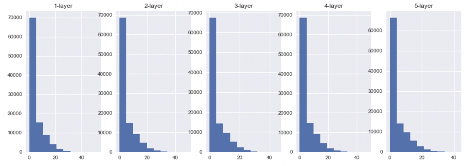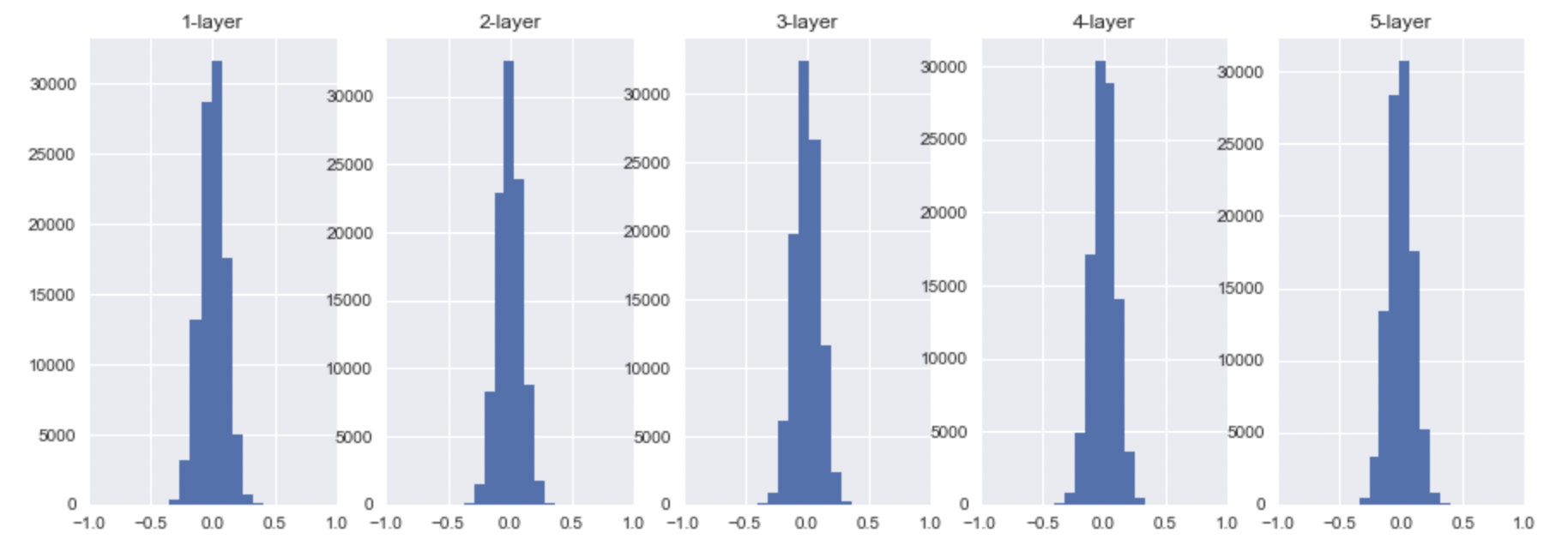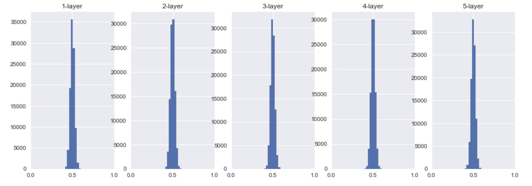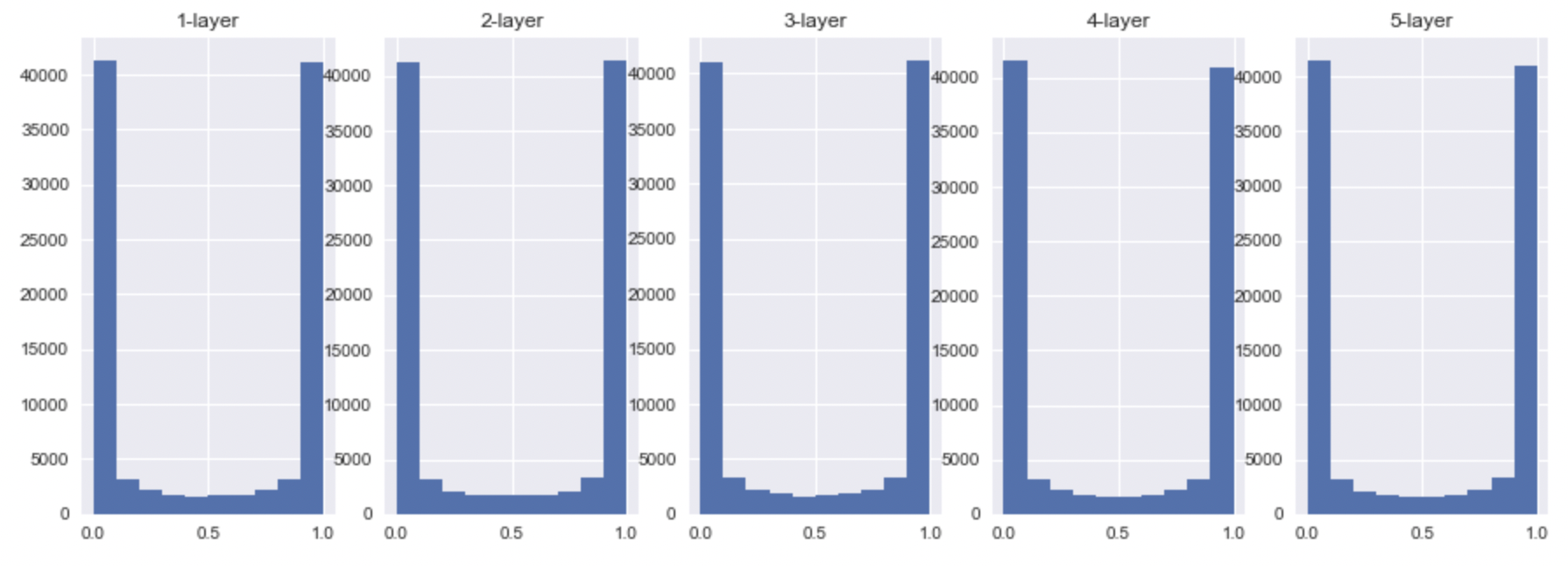 위에서 말했듯이, sigmoid의 activation value는 0.5로 모이게 될 것이고, tanh, ReLU의 경우에는 0으로 모이는 것을 확인할 수 있다.