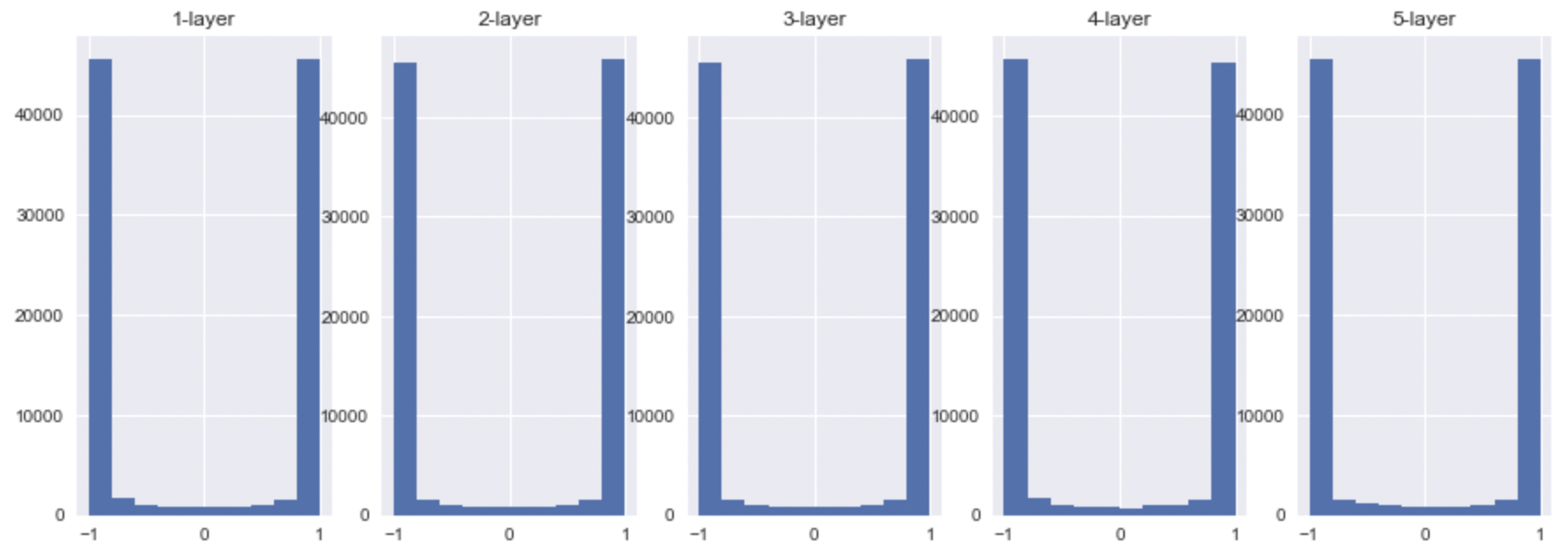 위 문제점은 우선적으로 Activation function을 Sigmoid를 사용하였을 때이다. 그렇다면, tanh나 ReLU의 경우는 어떻게 될지에 대해 의문이 생겼다. tanh의 경우에는 non-saturation 영역이 sigmoid보다 좁으므로 더 많은 값들이 saturation 될 것이라고 예상한다. 또한, ReLU의 경우는 0보다 작으면 0을 내보내고, 0보다 크면 자기 자신의 값을 그대로 내보내기 때문에 0에 activation value들이 많이 모일 것으로 예상한다.