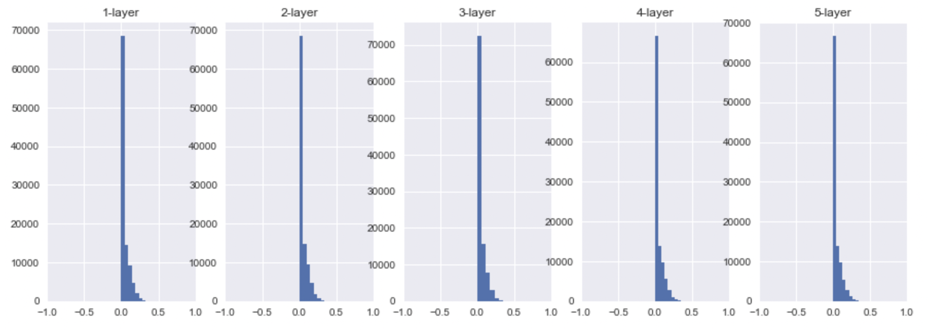 예상했듯이, tanh은 더 많은 값들이 saturation영역으로 빠진 것을 확인할 수 있었다. 또한, sigmoid는 activation value의 범위가 0~1인 것에 비해 tanh는 -1 ~ 1인것을 확인할 수 있었다. ReLU도 예상했듯이 saturation 영역인 0으로 많은 값들이 빠진 것을 확인할 수 있었고, 그 외의 값들은 굉장히 범위가 다양했음을 볼 수 있다. 이것은 또다른 문제를 발생시키는 데 이 출력 값들이 ( 또 다른 레이어의 입력값 ) 결국 backpropagation value에 관여되기 때문이다.