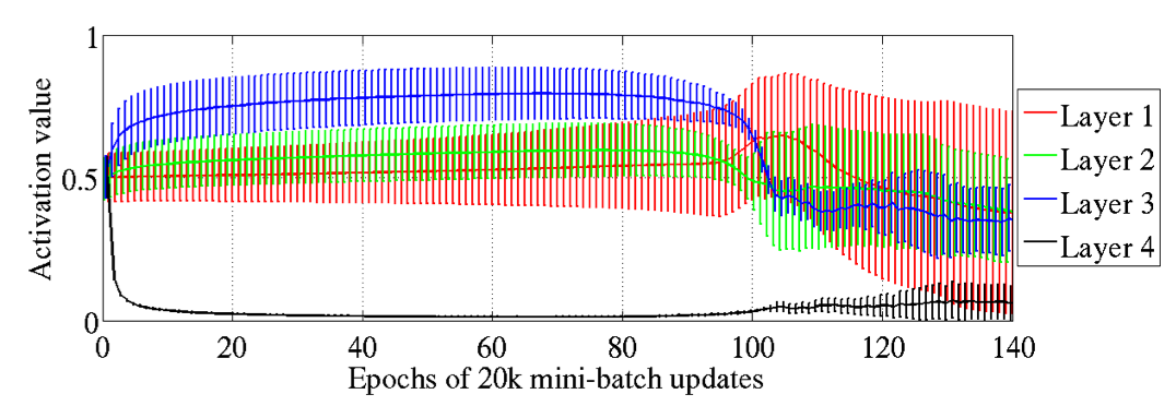 보이다시피, 학습이 시작되자마자 마지막 레이어가 0으로 수렴해버린다. 저자는 이 현상이 마지막 레이어의 bias 값이 너무 빨리 학습되어서일 것이라고 추측하였다. 즉, Back propagation 연산 과정 중 $X_j$가 안정적이지 못해 흔들리고 있을 때, 이 값과 관련없는 $\dfrac {\partial E}{\partial b}$가 수렴해버린다는 것 같다. 이러한 현상 때문에 학습의 속도가 느리고, 형편없는 일반화 결과가 나온다고 한다.