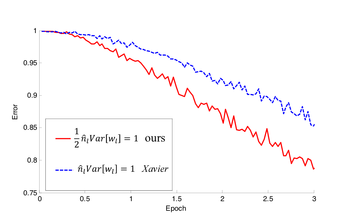 보이다시피, 레이어의 깊이가 얕은 모델 (그림 1)에서는 Xavier와 He initialization 모두 학습하는 것을 볼 수 있지만, He initialization이 더 빨리 학습하기 시작한다. 또한, 성능도 He initialization을 사용했을 때, 더욱 우수하였다고 한다.