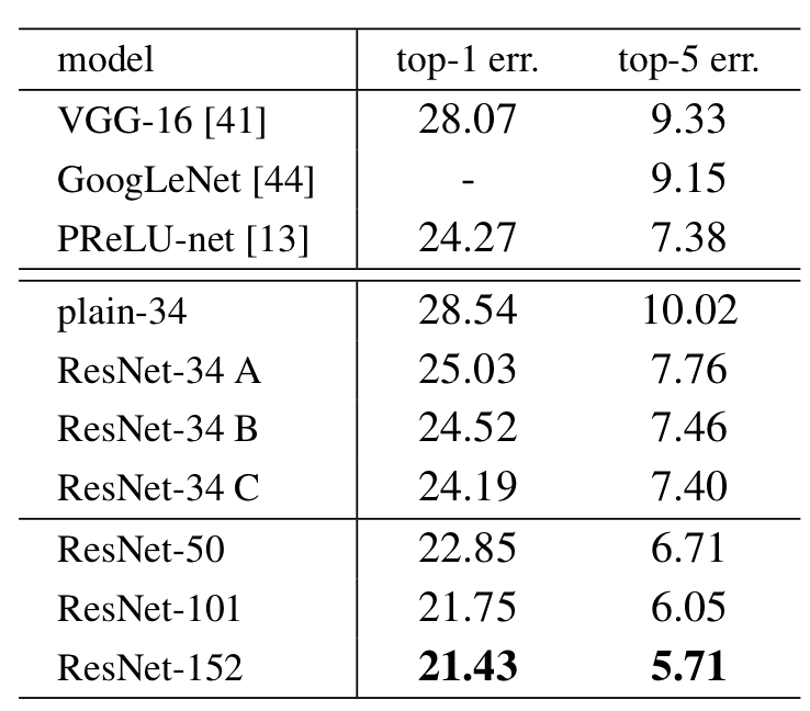 - ResNet-34의 top-1 error는 25.03%로써, Plain-34보다 3.5%가량 낮았다. 이는 Residual Learning의 효율성을 입증한다.