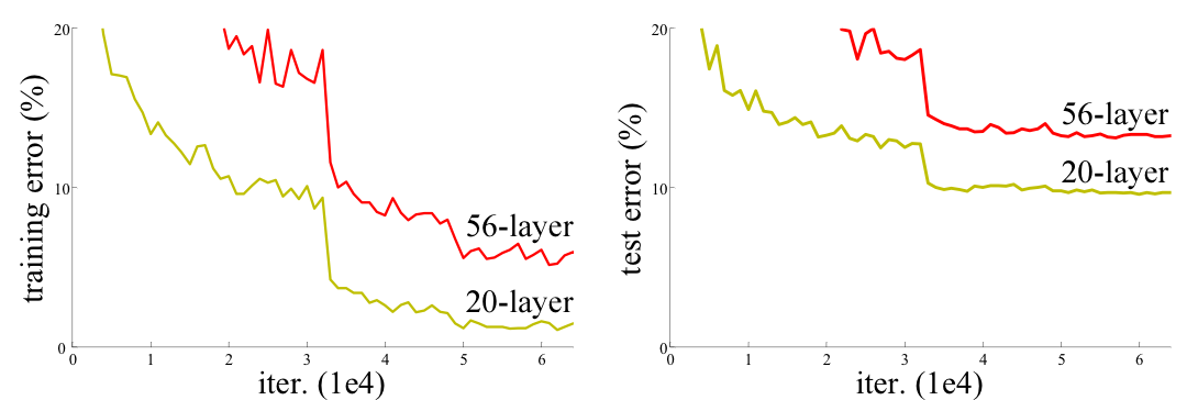 진짜로 문제가 되는 것은 degradation problem이다. degradation problem은 레이어를 깊게 쌓을수록 오히려 train / test error가 커지는 문제를 뜻한다. 이는, 레이어가 깊어질수록 train error는 작아지지만, test error가 커지는 Overfitting problem과는 다른 문제다.