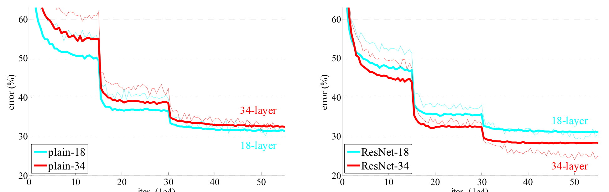 - 18개의 레이어에서는 두 모델 모두 잘 수렴하였지만, ResNet이 수렴속도가 더 빨랐다.