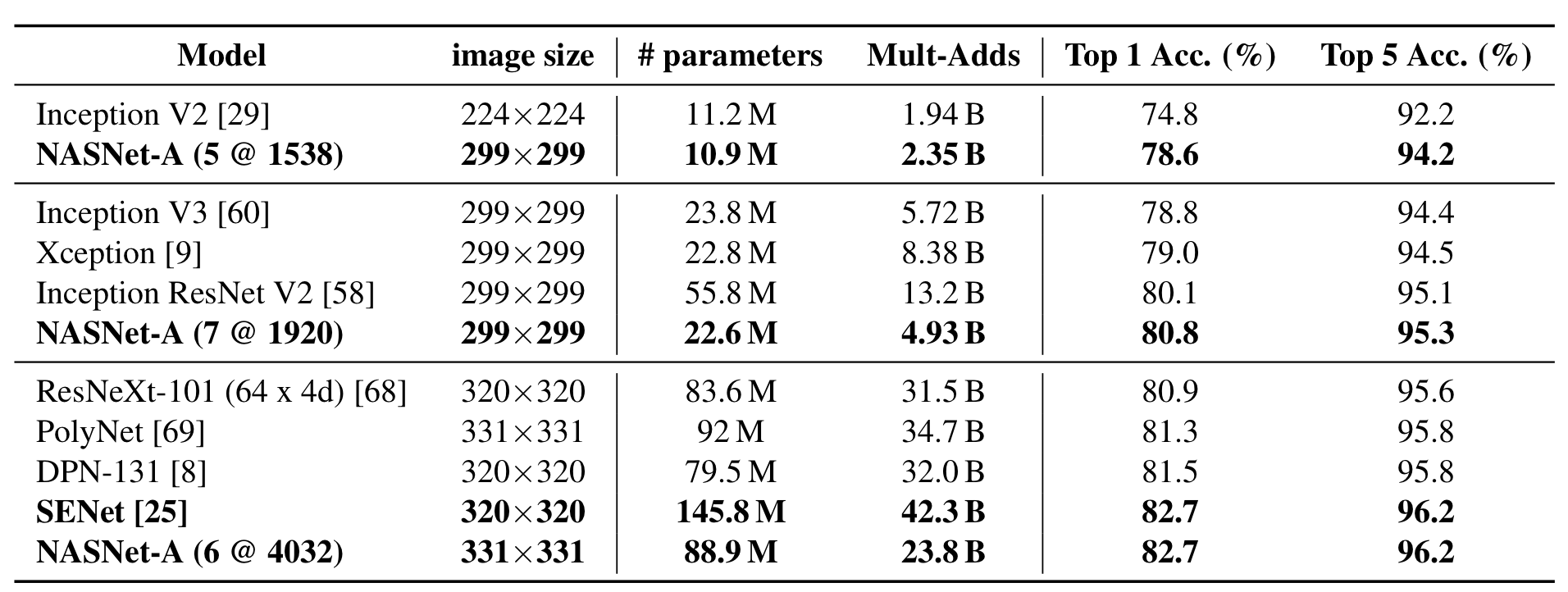 결과는 위와 같이 NASNet이 더욱 적은 파라미터 개수로 SOTA를 달성하였다.