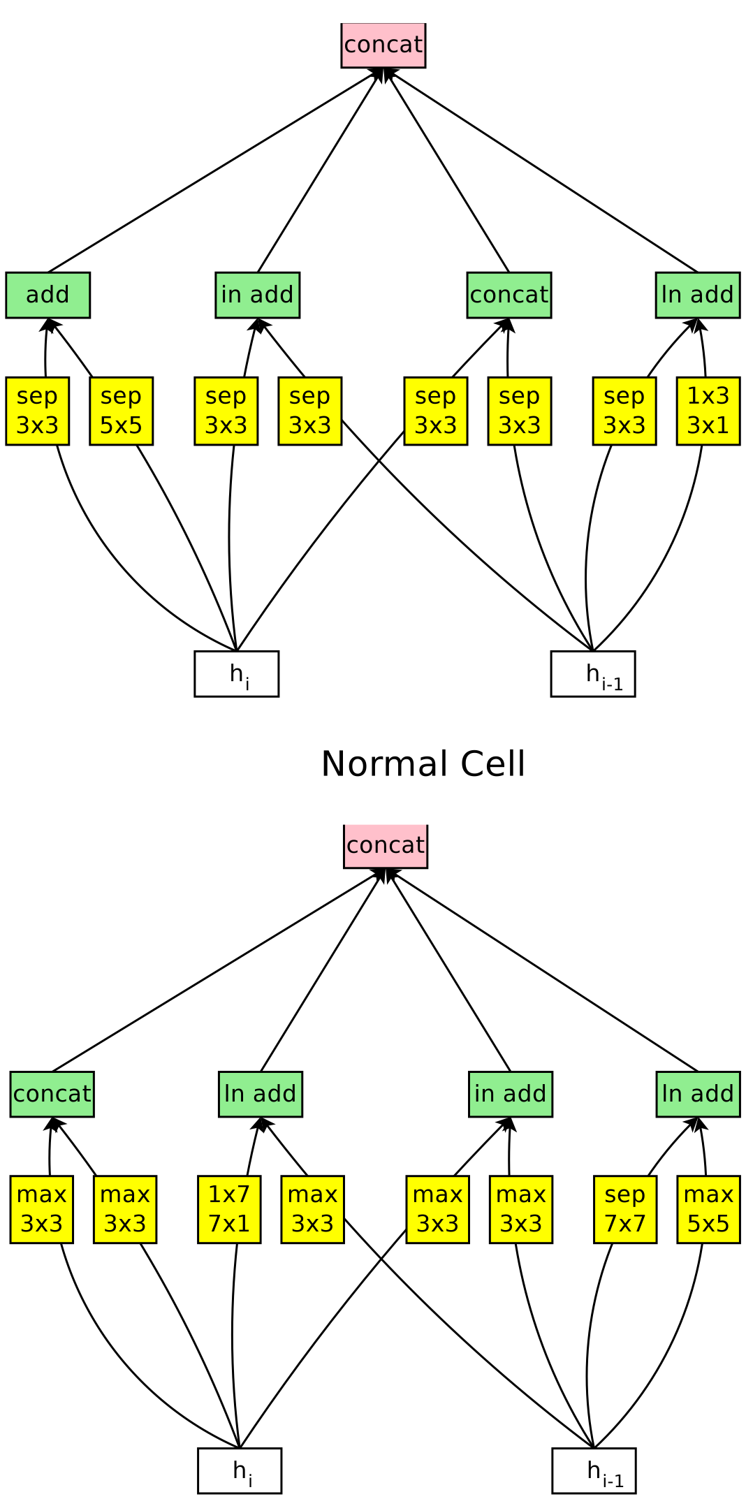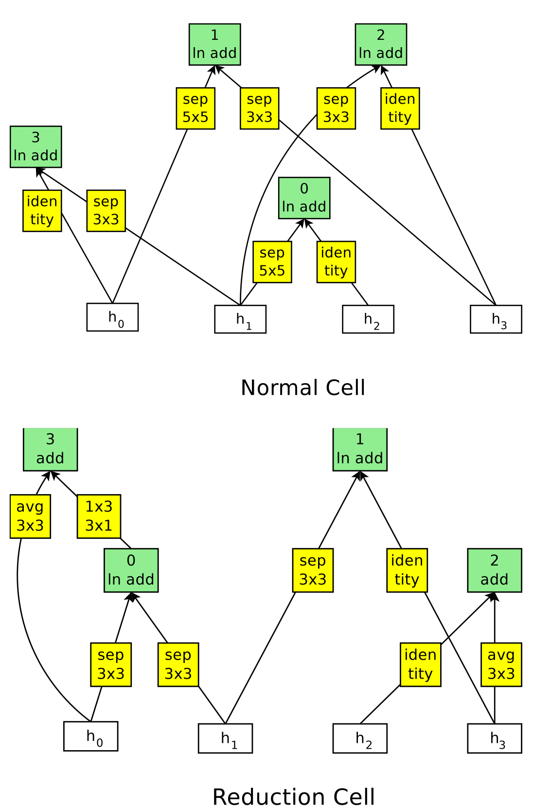NASNet은 feature map 크기를 유지하는 1 ) Normal Cell과 feature map 크기를 절반으로 줄이는 2 ) Reduction Cell로 이루어진다. 즉, Nerual Search Architecture는 RNN을 이용하여 Normal Cell과 Reduction Cell을 찾는다.