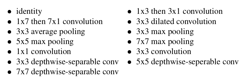 NAS 알고리즘의 Step 3와 Step 4에서 어떠한 연산을 취할 것인지 결정한다고 하였다. 만약에 이 "어떠한 연산"이 무한한 가능성을 가진다면 시간이 오래 걸릴 뿐더러 강화학습이 최적의 결과를 못찾을 가능성이 있다. 그렇기 때문에 이 "어떠한 연산"을 제한된 범위 내에서 선택하도록 하고, 이는 아래와 같다.
