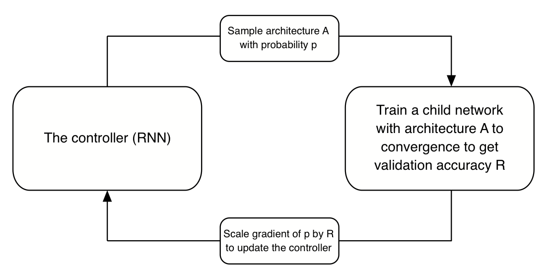 Neural Architecture Search에서는 RNN이 서로 다른 구조의 자식 네트워크를 샘플링한다. 자식 네트워크들은 Validation 데이터 셋에 대해 어느정도의 성능을 보일 때까지 학습을 하고, 그 결과는 RNN이 더욱 좋은 모델을 생성하는 데에 사용된다. RNN의 가중치는 Policy Gradient에 의해 업데이트 된다 (Policy Gradient는 강화학습 알고리즘 종류 중 하나입니다).