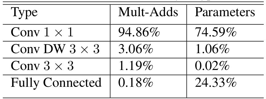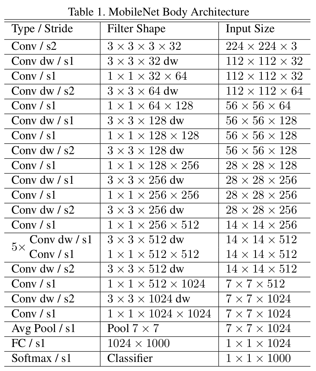 위 표를 통해, MobileNet의 파라미터와 계산량은 대부분 1 x 1 Conv에 몰려있음을 알 수 있다.