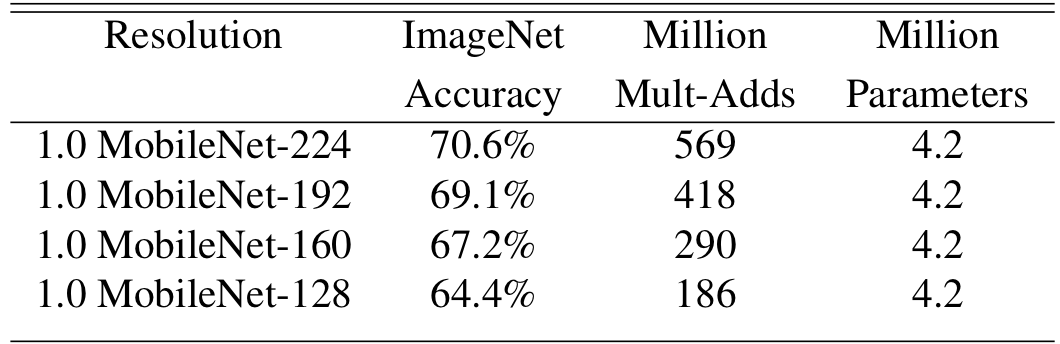 위 표는 resolution multiplier 하이퍼 파라미터를 바꿔가며 성능을 비교하였는데, $\rho$가 감소함에 따라, 성능이 급격히 감소하진 않았다.